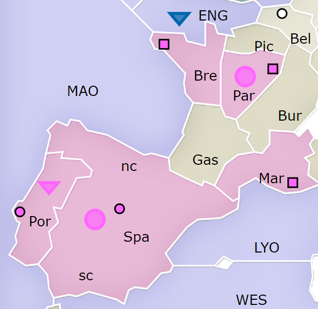 - 브레스트(Bre)로 들어오는 영국 해군을 막을 수 있는 건 파리(Par)에 있는 육군이나 중앙 대서양(MAO)에 있는 해군이다. 그러나 해군으로 막으면 파리에 있는 육군으로 점령할 수 있는 새로운 병참 지역이 주변에 없다. 따라서 육군으로 영국 해군을 막고, 해군은 해안 지역인 포르투갈(Por)을 점령하는 것을 선택했다.