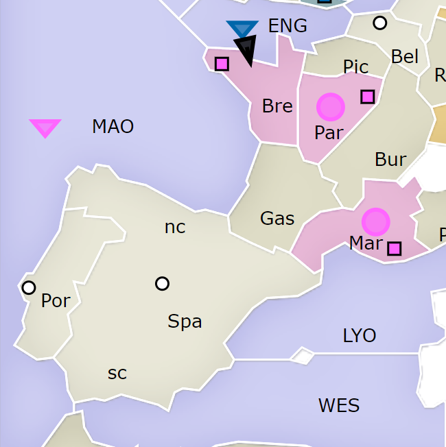 당신은 파리(Par)에 있는 육군(분홍색 원)과 마르세유(Mar)에 있는 육군(분홍색 원), 그리고 중앙 대서양(MAO)에 있는 해군(분홍색 세모)으로 2개의 새로운 병참 지역을 점령하면서, 브레스트(Bre)로 들어오는 영국 해군을 막는 명령을 내리십시오.